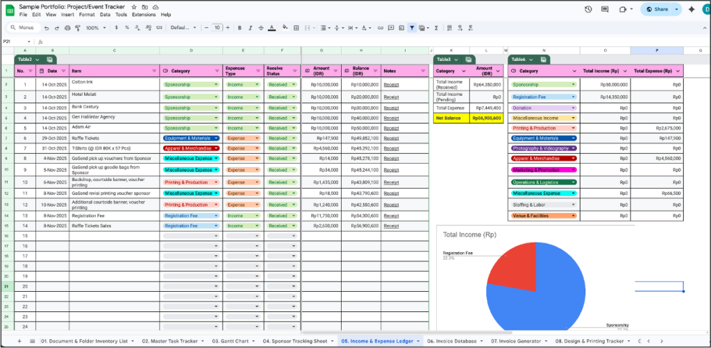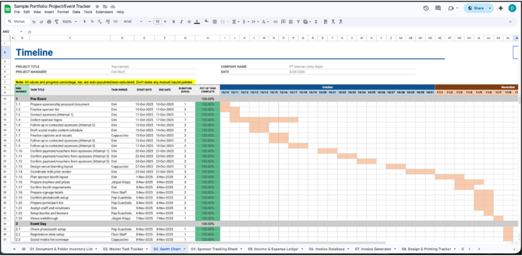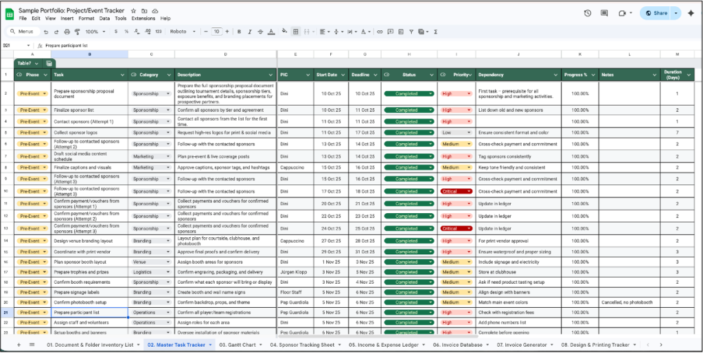 All data shown in this document are dummy data created solely for portfolio demonstration purposes. The structure, workflow logic, and tracking approach reflect my real-world project management practices used in handling events, sponsorship coordination, client deliverables, and operational tasks.